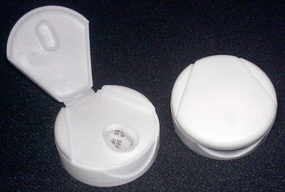 One-piece design combines ease of use, shelf impact, and safe and secure packaging. One-hand action and the lid stays open. No interference with dispensing flow. Audible “snap” ensures plastic cap is closed. Consumers have peace-of-mind that the product is safely and securely contained. Drip-resistant, cut-off feature eliminates mess. Each cap contains a liner with a tamper resistant seal.