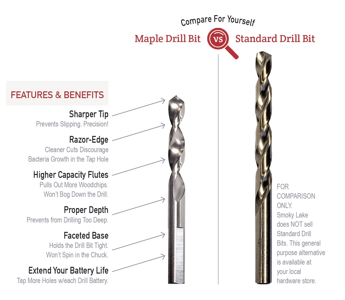 I received this drill bit as a special offer free item with an order two seasons ago but did not use it until this season. All I can say is WOW! I had been using bits from my tool box to drill tap holes but never again. This bit is sharp and does a fine job of cleaning out the hole. This bit will pull itself into the tree where traditional bits need to be pushed. This bit will be kept back special for tapping and replaced with a new one if needed.