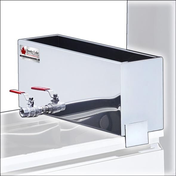 Feed Pan Option: Fill the feed pan with raw sap and allow sap to slowly trickle into the main pan. This offers convenience and also efficiency because the Feed Pan helps preheat the raw sap. This Feed Pan has a 4+ gallon capacity.