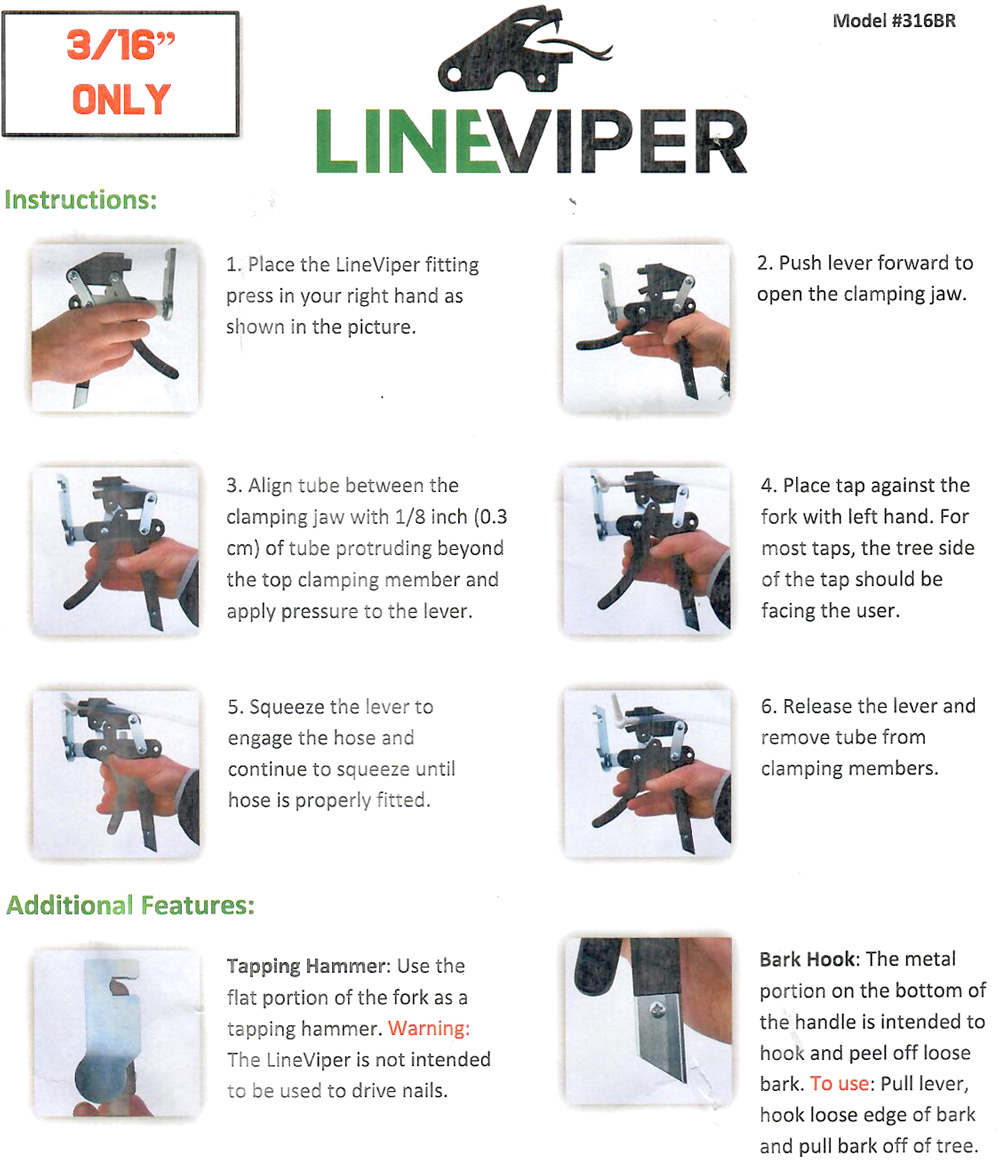 The main function of this tool is to easily connect spouts or other fittings to tubing. Other features include a Tapping Hammer to seat spouts in the tree and a Bark Hook to remove loose bark from a tree.