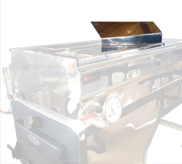 This is a 2-foot-wide splash guard which easily attaches to the side rim of your Smoky Lake hybrid pan to help contain any drips during a really hard boil. Most commonly this splash guard is requested for only one side of the pan, the side opposite the inlet sap port. This is because incoming sap is usually colder, and as a result, splashing is generally a concern on only one side of the pan.