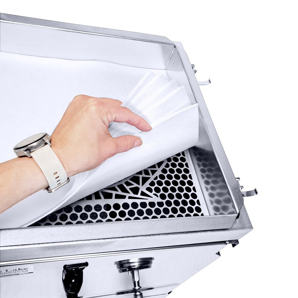 • For this Vacuum System, the Flat Filter Set needs to be able to lay flat on the bottom of the Filter Tray in order for all of the system’s components to fit together perfectly. In contrast, when you are filtering with gravity, the Flat Filter Set needs to be larger in order to create a bowl shape within the Filter tray. When the vacuum applicator is used, the pressure frame makes a positive seal, disallowing syrup from leaking around the filters.